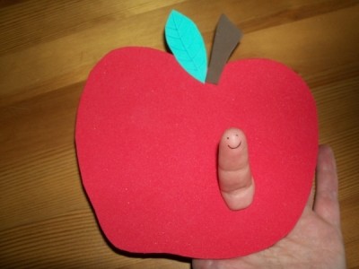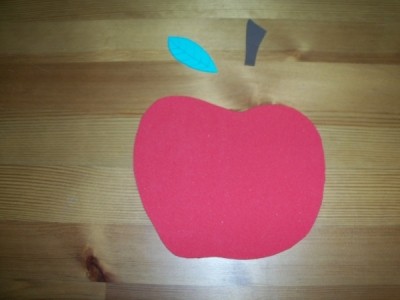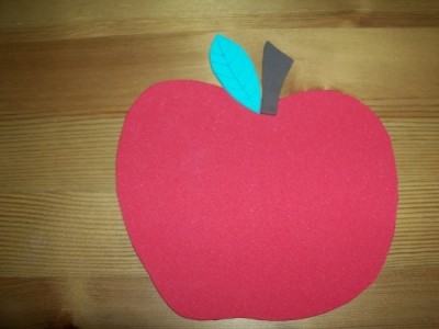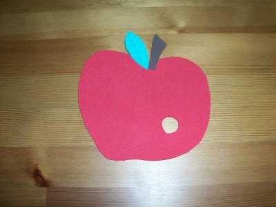 Aus dem roten Moosgummi schneidet ihr eine Apfelform, etwa so groß wie eine Untertasse, aus dem grünen ein Blatt und aus dem braunen den Apfelstiel. Malt mit dem Filzstift die Blattadern auf.