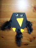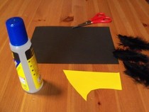 1. Man benötigt ein rechteckiges Stück Tonpapier in schwarz, ein kleines Stück gelbes Tonpapier, drei schwarze Federn, Schere, Kleber und 2 Wackelaugen.