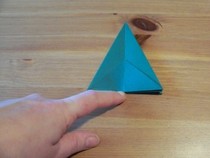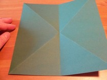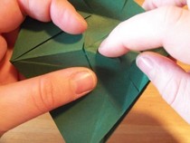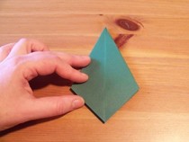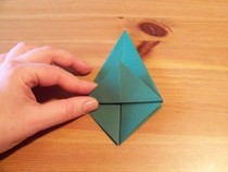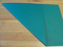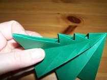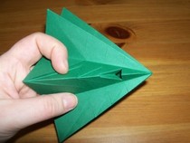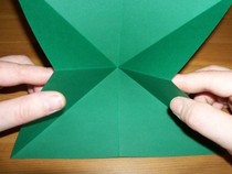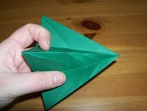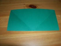 11. Den entstandenen Knick wieder halb öffnen. Wenn man nun von oben auf die Kante drückt, lässt sich die entstandene Tasche flach drücken zu einer Drachenform.