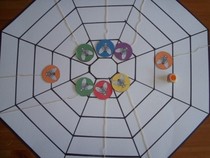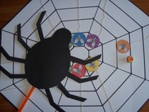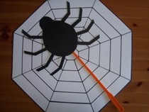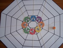 5. Einer spielt die Spinnenklatsche, die anderen sind die Fliegen und ergreifen ein Band. Alle Fliegen starten auf dem inneren Kreis. Nun würfelt der Spinnenspieler. Die Fliegenspieler, deren Farbe erscheint, müssen schnell an ihrem Band ziehen, um ihre Fliege vor der Spinne zu retten, alle anderen müssen ihre Fliege sitzen lassen.