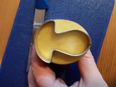 Jetzt kann man mit Hilfe des Katapultes versuchen, die "Kometen" in die Vertiefungen der "Planetenoberfläche" zu schleudern. Hierfür wird der "Komet" auf die längere Seite des Katapultes gelegt und mit dem Finger schwungvoll auf die kürzere Seite gedrückt. Beim Kindergeburtstag kann man prima kleine Schokolinsen in die Vertiefungen legen, wer trifft, bekommt diese süße Belohnung.
