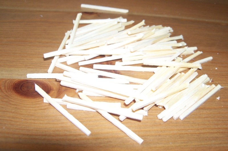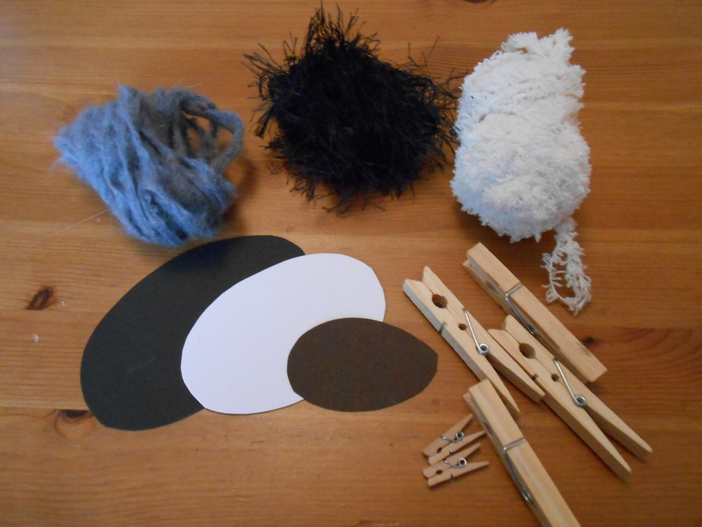 Man braucht eine Eierpappe (bekommt man kostenlos im Supermarkt), Wattekugeln in etwa der Größe eines Tischtennisballes, Krepppapier oder Geschenkband in den Farben rot, gelb und orange, ein Holzleistenstück mit etwa 12 cm Länge, einen dickeren Holzdübel, Klebe und Farben.