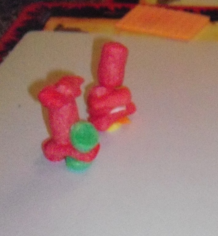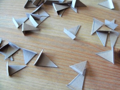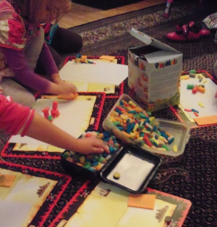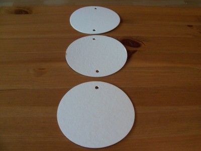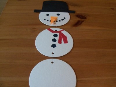 Diese Bastelarbeit eignet sich mit etwas Hilfe für Kinder ab 3 Jahren. Man benötigt drei Pappscheiben (z.B. unbedruckte Bierdeckel), Tonpapierreste, Stifte, einen Locher, Klebe und Faden.